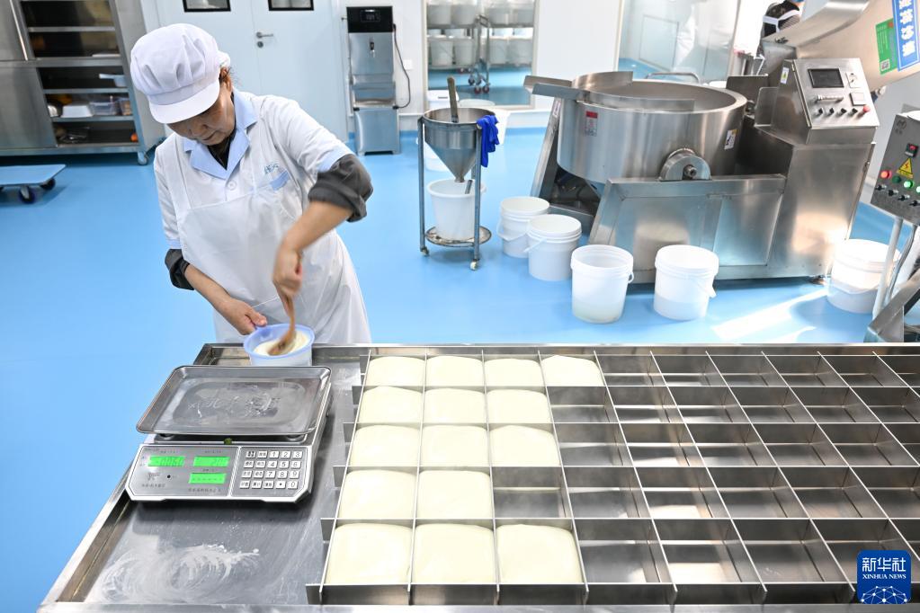 3月31日,在鑲黃旗民族傳統奶制品產業園的一家奶制品企業生產車間,工作人員將融化的奶豆腐裝入模具。