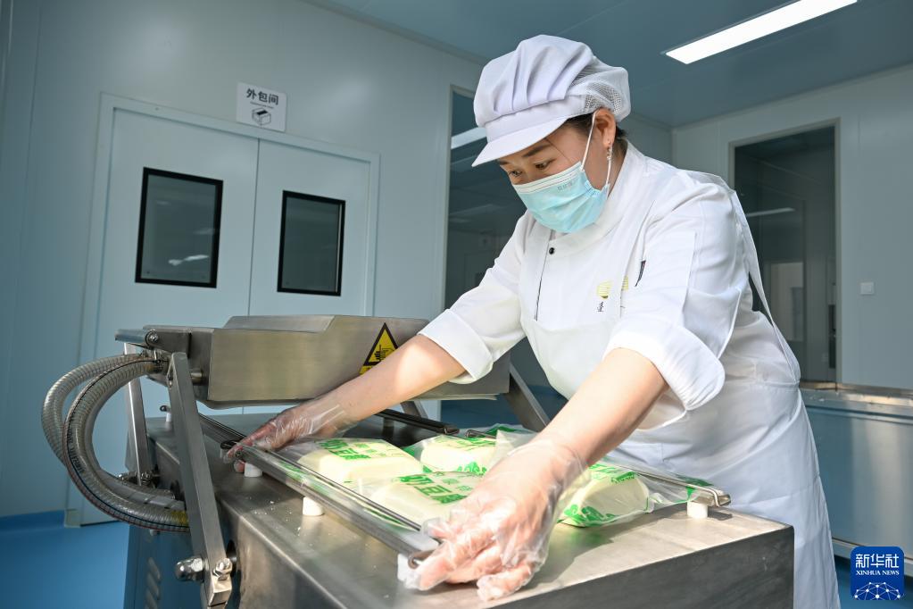 3月31日,在鑲黃旗民族傳統奶制品產業園的一家奶制品企業生產車間,工作人員包裝奶豆腐。