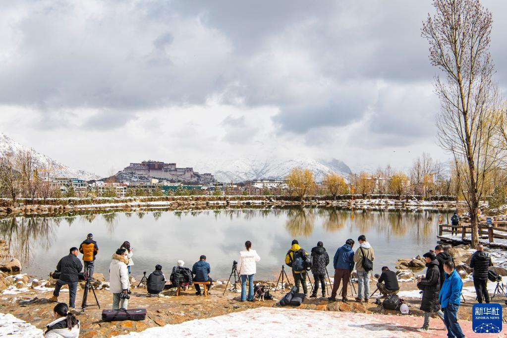 攝影愛好者在拉薩南山公園拍攝雪景(3月30日攝)。
