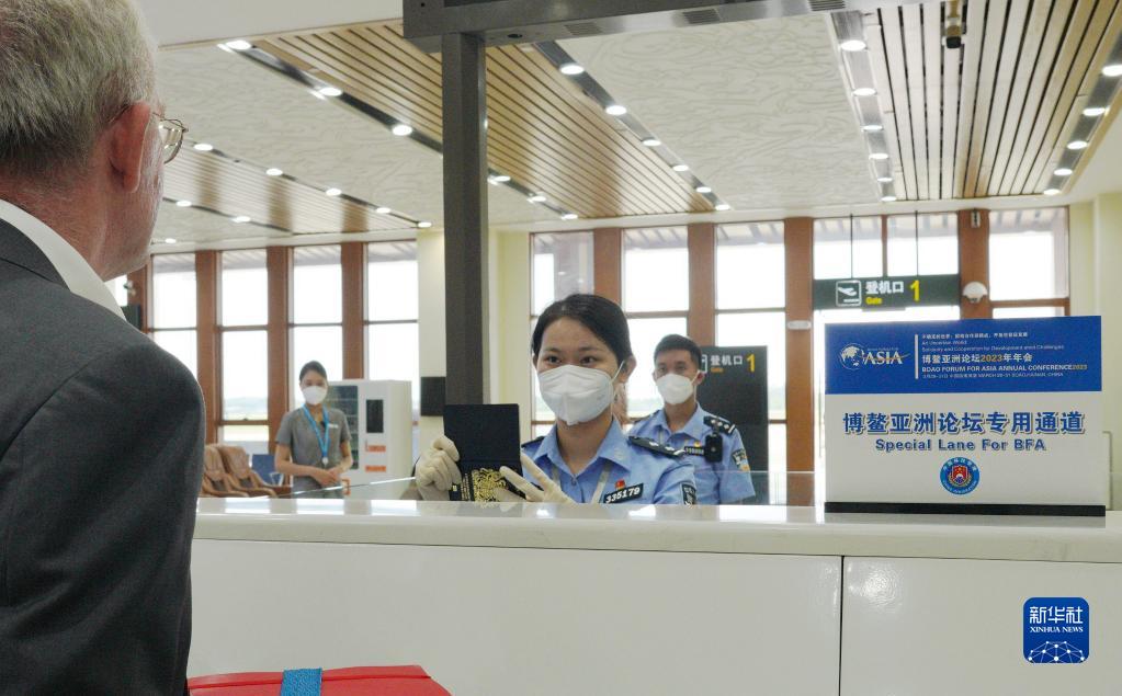 3月31日,在博鰲機場,美蘭出入境邊防檢查站執勤民警在博鰲亞洲論壇專用通道為與會嘉賓提供通關服務。