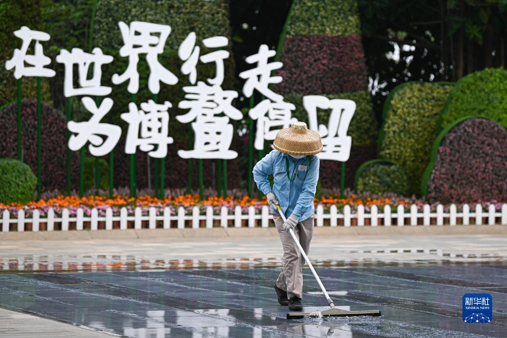 3月31日,工作人員在博鰲亞洲論壇國際會議中心清理地面的雨水。