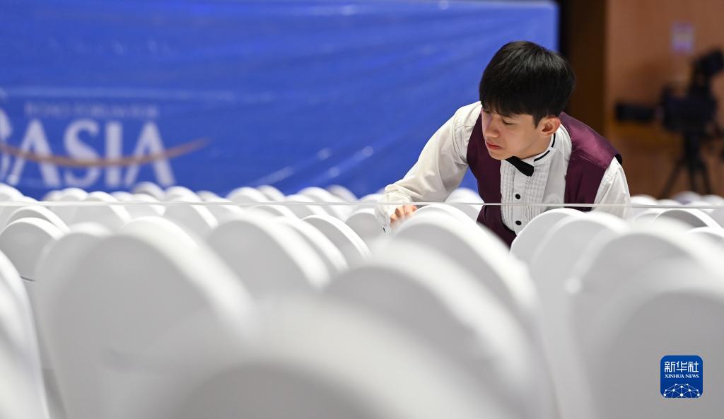工作人員在博鰲亞洲論壇主會場進行準備工作(3月27日攝)。