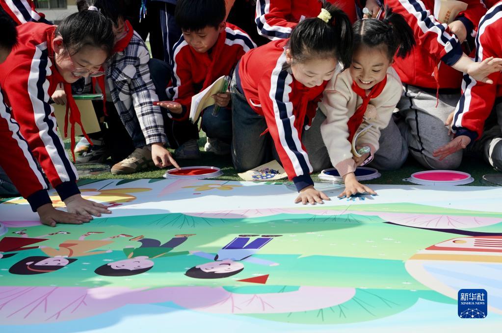 3月31日,徐州市漢橋小學的學生在“鐵路安全你我他”宣傳畫上印上手印。