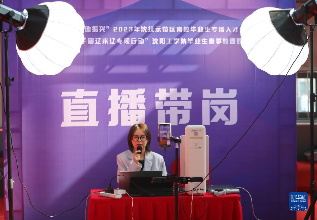 3月31日,在沈陽工學院體育館,直播帶崗專區工作人員通過網絡平臺對雙選會進行直播,滿足不能到場學生的就業需求。