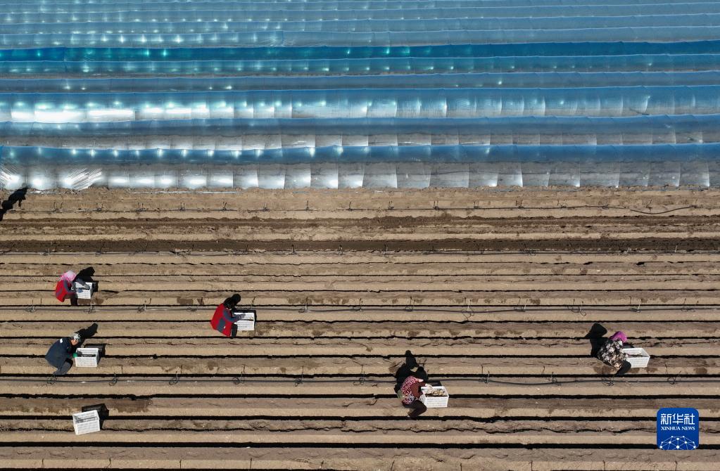 3月31日,唐山市豐潤區新軍屯鎮的農民在田間種植生姜(無人機照片)。