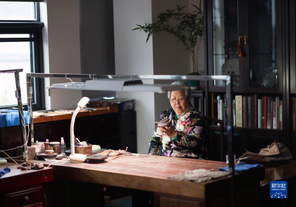 3月30日,曹婉芬在江蘇宜興的工作室制作紫砂壺。