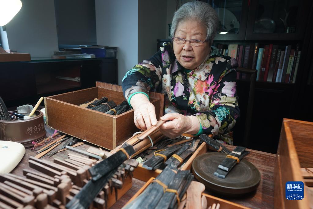 3月30日,在曹婉芬紫砂藝術館,曹婉芬在展示自制的制壺工具。
