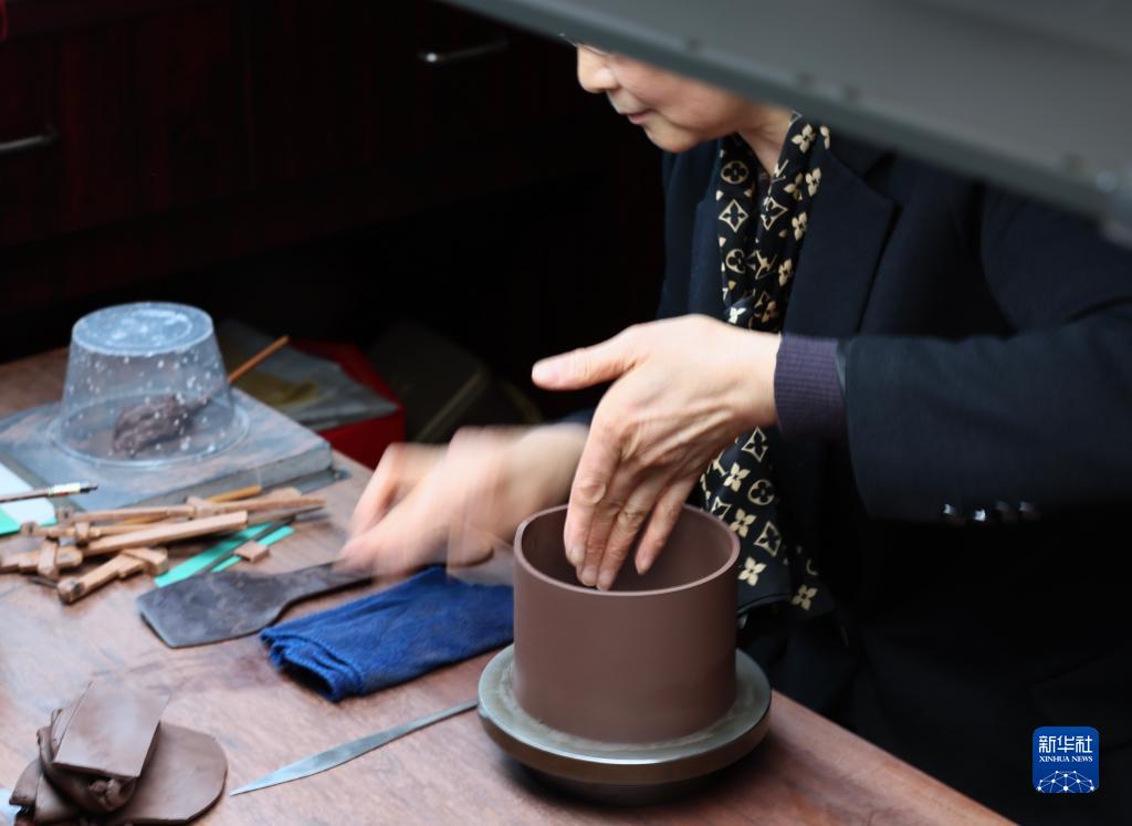 3月30日,曹婉芬的兒媳費寅媛在江蘇宜興的工作室制作紫砂壺的身筒。