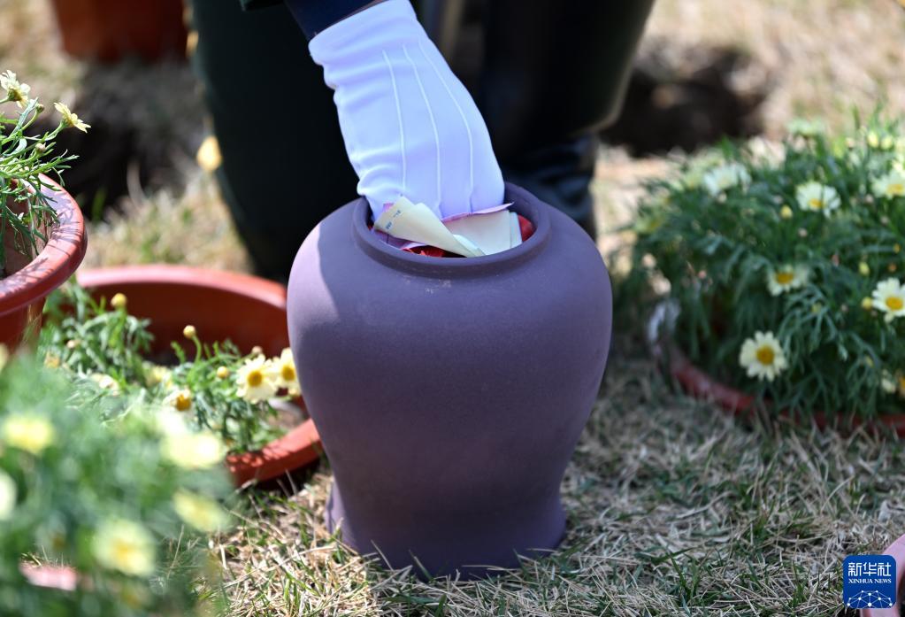 3月31日,在天津憩園,禮儀人員準備將可降解骨灰壇放入穴坑。