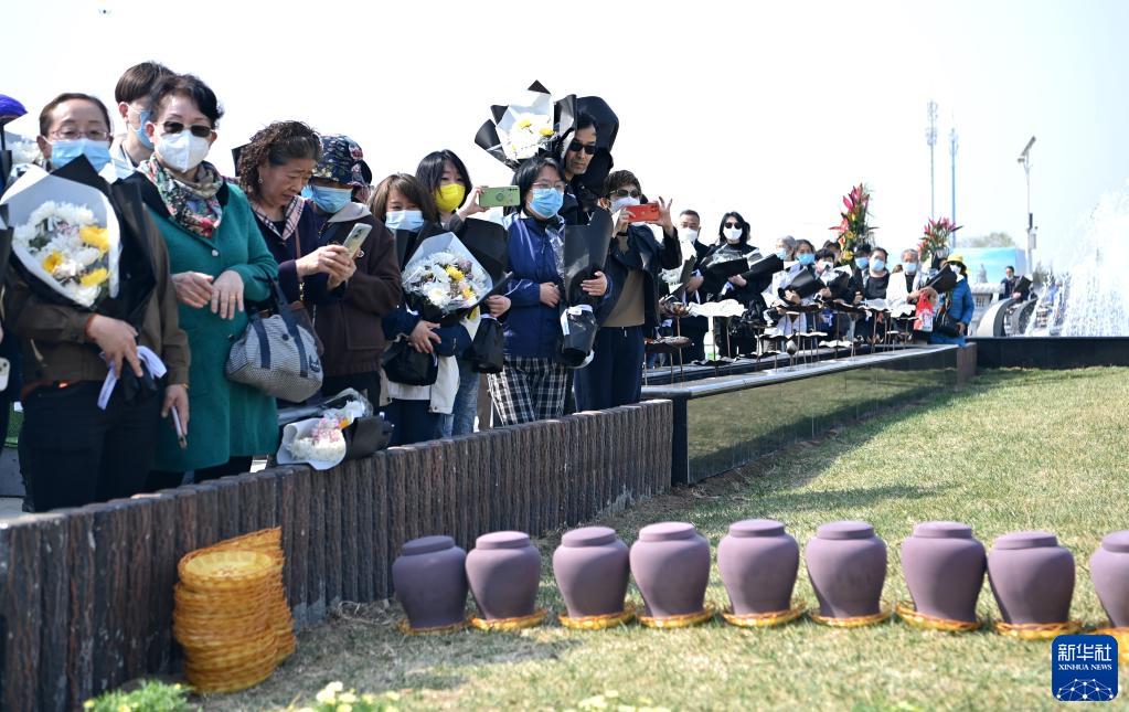3月31日,在天津憩園,遺體捐獻者家屬在埋葬骨灰處表達哀思。