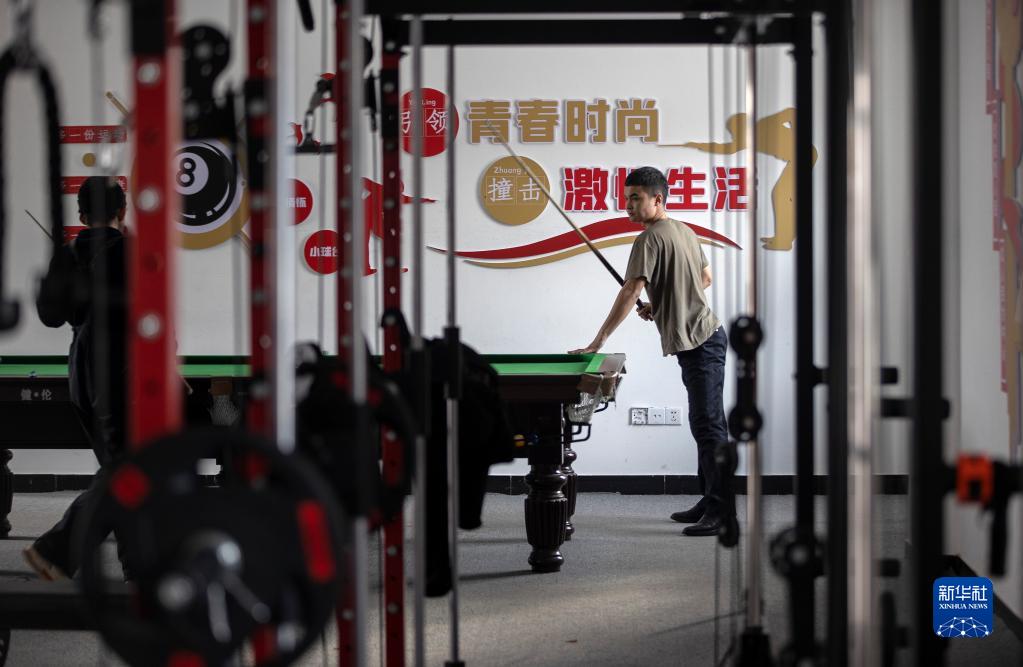 3月30日,村民在村民健身娛樂室打臺球。這里的健身和娛樂設施都是免費向村民們提供的。