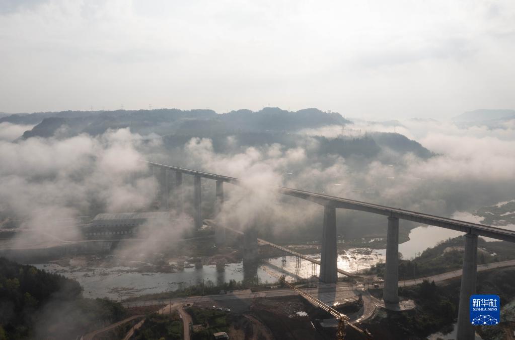 俯瞰云霧中的漢巴南鐵路恩陽河特大橋(3月30日攝,無人機照片)。
