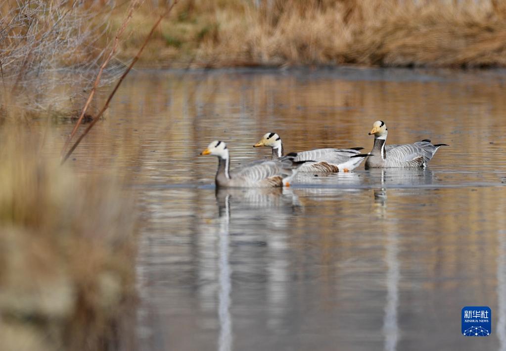 斑頭雁在拉魯濕地游弋(3月30日攝)。
