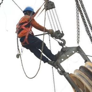 當日,在福建漳州核電500千伏送出工程施工現場,施工人員在橫跨1500米的漳江跨越線路百米上空進行四回線路同時跨江作業,全力推進工程進度。