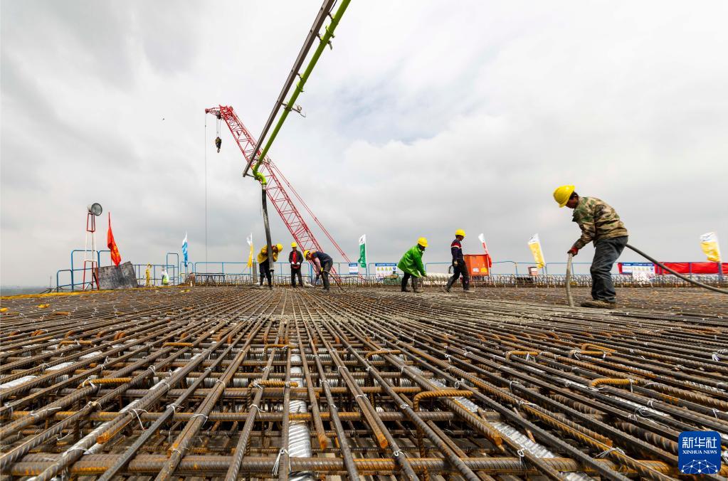 3月30日,中交二航局工人在安徽省馬鞍山巢馬城際鐵路建設現場進行首跨公路梁混凝土澆筑作業。