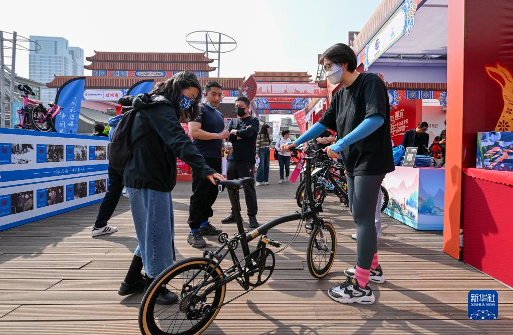 3月31日,在天津海河古文化街親水平臺,游客試騎津城老字號品牌飛鴿牌自行車。