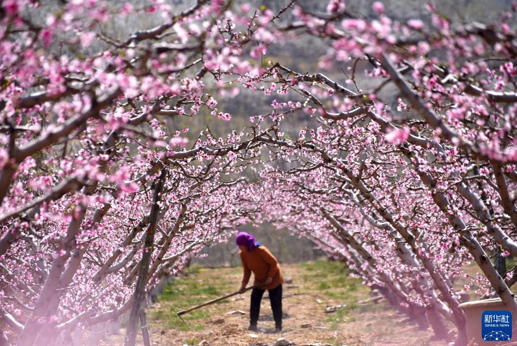 春暖花開時節,農民伴著花香忙農事,一派生機盎然的景象。