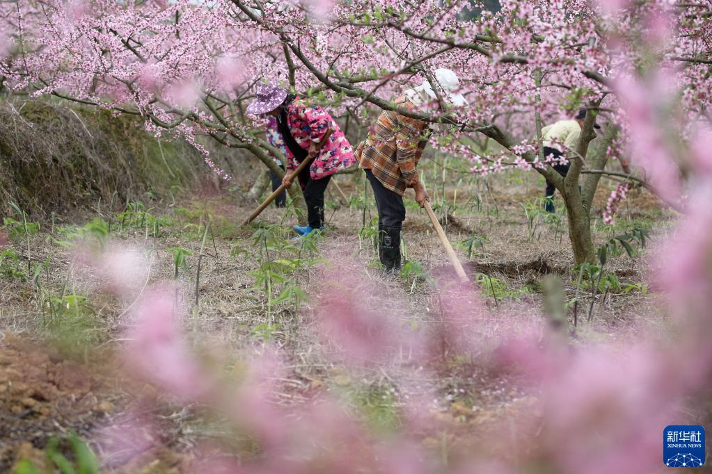 春暖花開時節,農民伴著花香忙農事,一派生機盎然的景象。