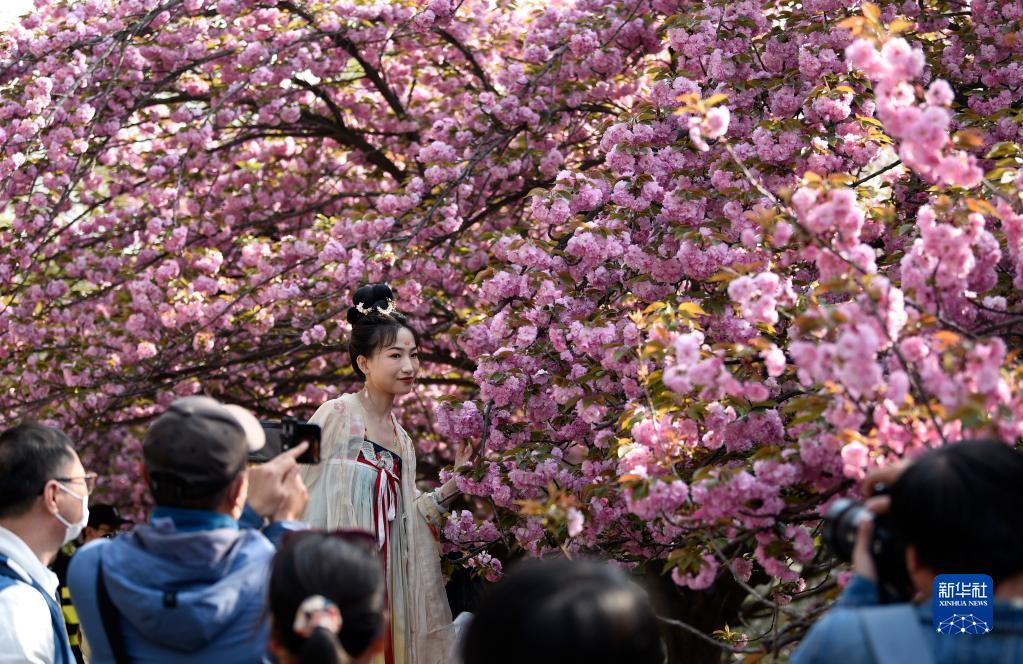 陜西省西安市青龍寺遺址景區內,國風愛好者在賞花留影(3月31日攝)。