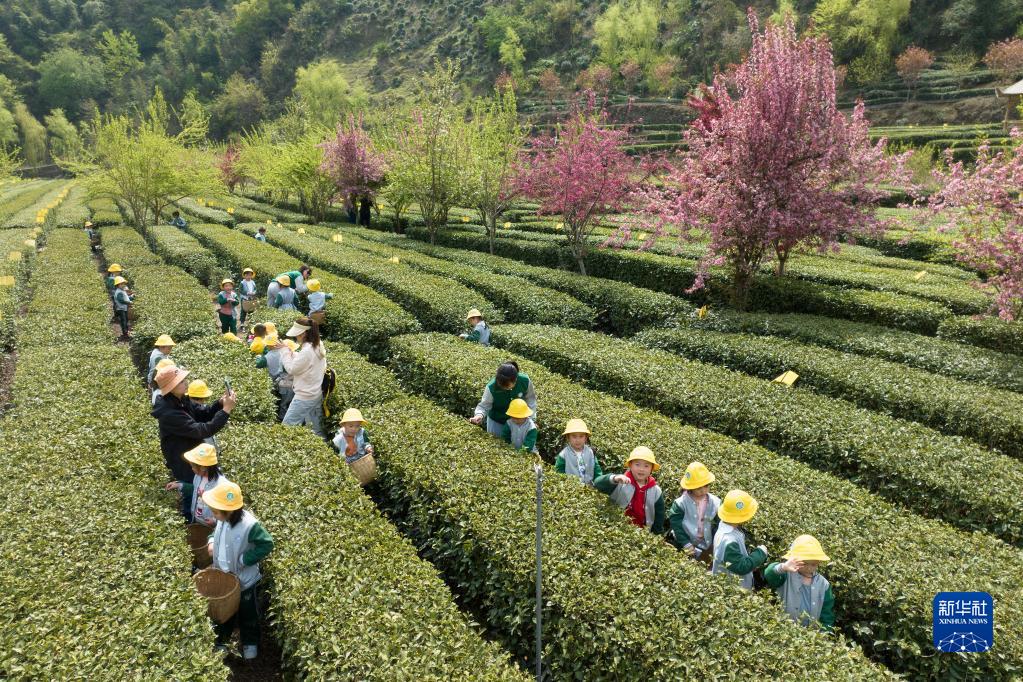3月31日,在安康市漢濱區大竹園鎮一處茶園內,小朋友在老師的帶領下進行采茶體驗活動。