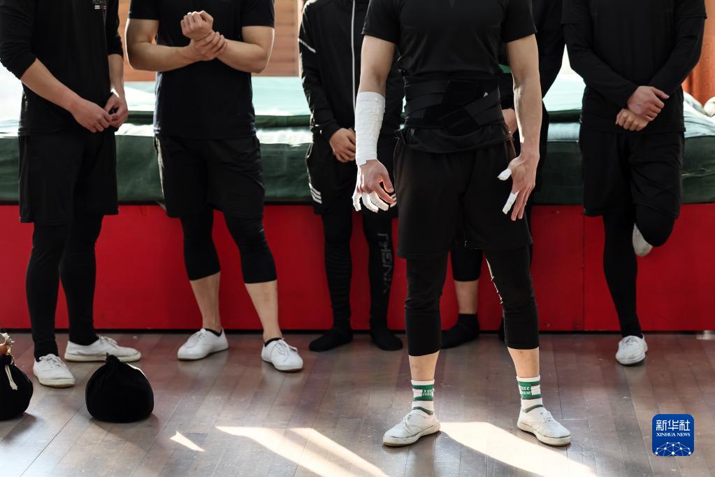 3月31日,演員們在位于江蘇省鹽城市建湖縣的江蘇省雜技團訓練間歇休息。