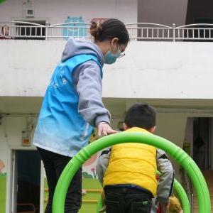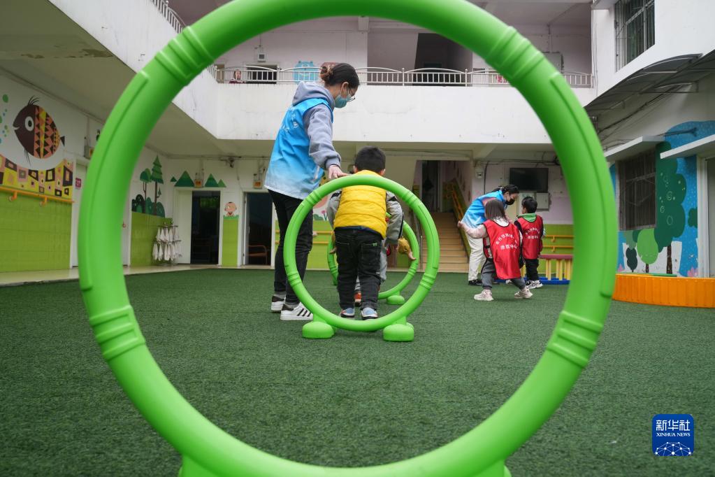 3月31日,在重慶市北碚區奔月鐵路幼兒園康教中心,特教老師幫助孤獨癥兒童進行感統訓練。