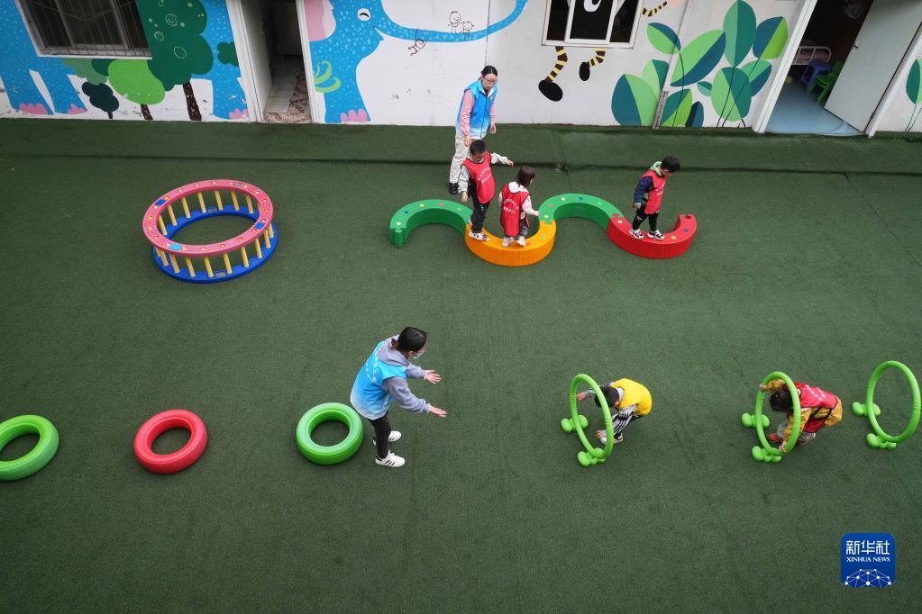3月31日,在重慶市北碚區奔月鐵路幼兒園康教中心,特教老師幫助孤獨癥兒童進行感統訓練。