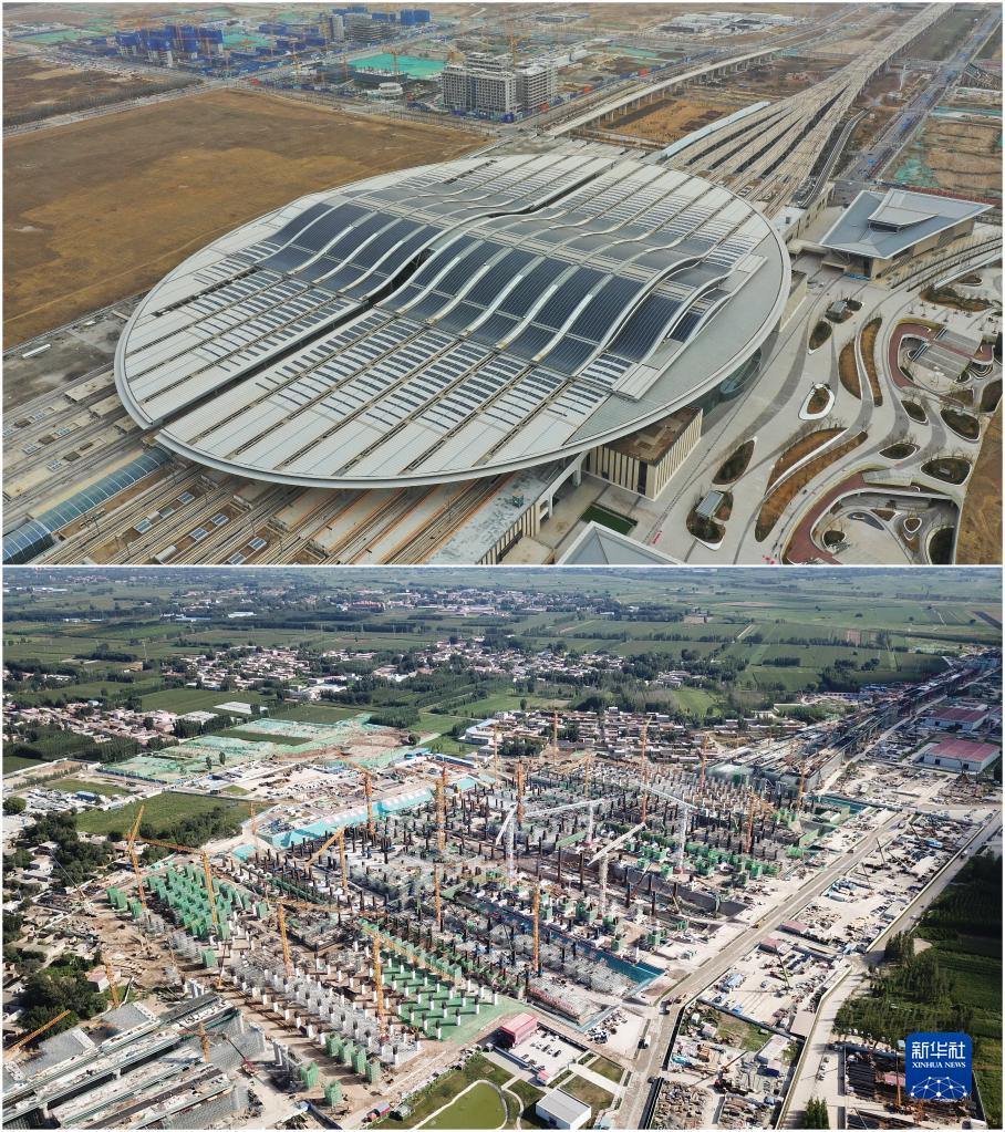 拼版照片:上圖為2023年3月23日拍攝的京雄城際鐵路雄安站(無人機照片);下圖為2019年8月29日拍攝的京雄城際鐵路雄安站建設現場(無人機照片)。
