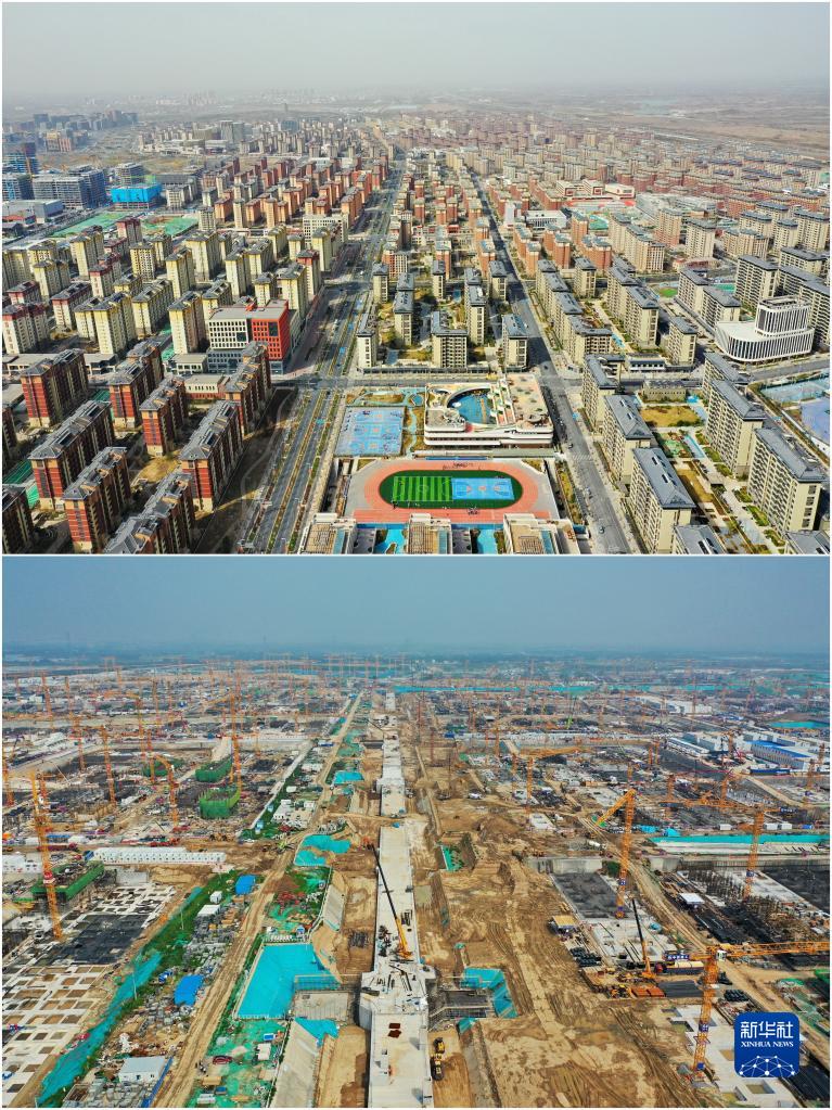 拼版照片:上圖為2023年3月24日拍攝的雄安新區容東片區(無人機照片);下圖為2020年8月11日拍攝的雄安新區容東片區建設現場(無人機照片)。