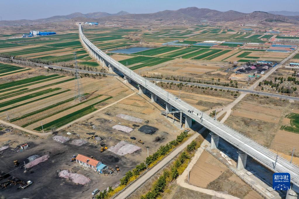 鳥瞰萊榮鐵路跨威青高速特大橋段(3月31日攝,無人機照片)。