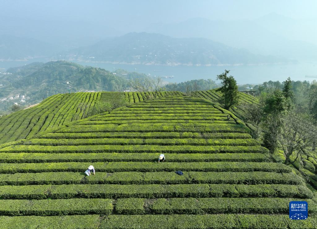 4月1日,茶農在秭歸縣茅坪鎮松樹坳村茶園采摘“明前茶”(無人機照片)。