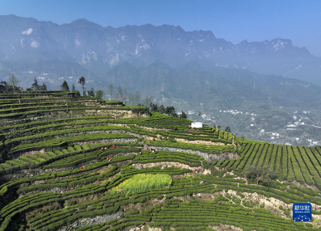 4月1日,茶農在秭歸縣茅坪鎮一茶園采摘“明前茶”(無人機照片)。
