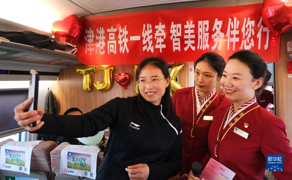 4月1日,在天津西至香港西九龍G305次列車上,旅客與乘務人員拍照留念。