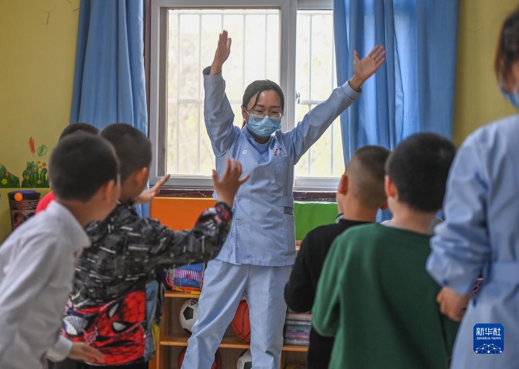 3月30日,在西安市金色陽光康復中心,特教老師引導孩子們做體操。