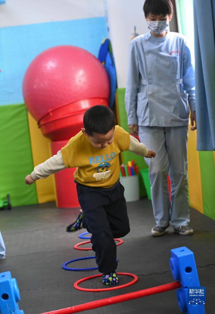3月30日,在西安市金色陽光康復中心,特教老師指導孩子進行康復訓練。