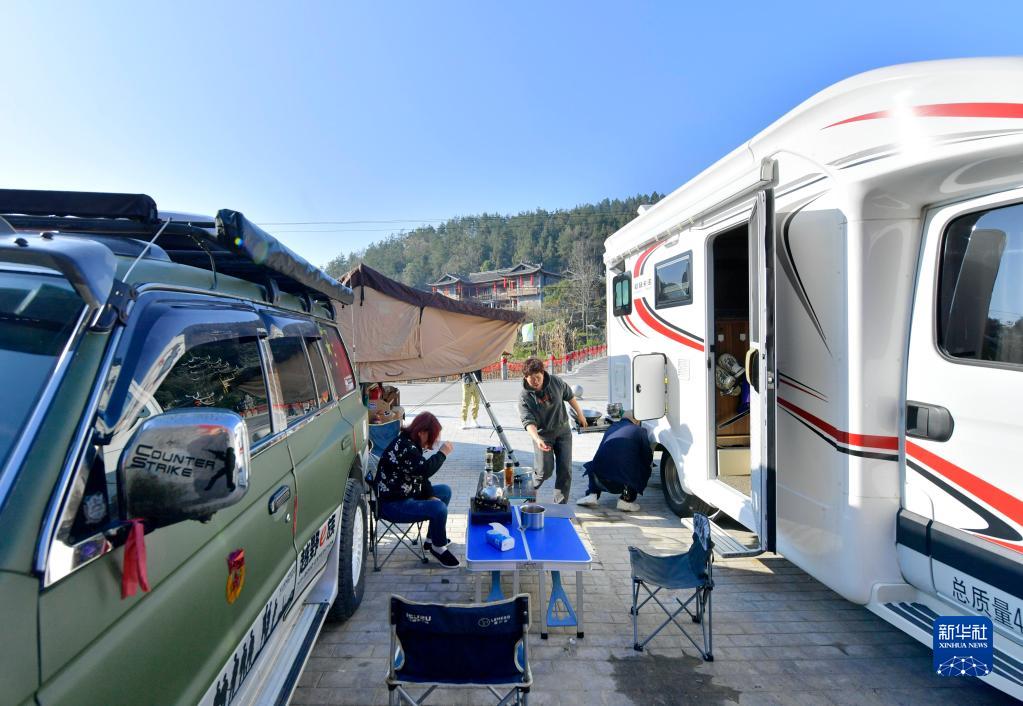4月1日,在宣恩縣椒園鎮黃坪村,開著房車旅行的游客在梨園旁的空地上準備早餐。