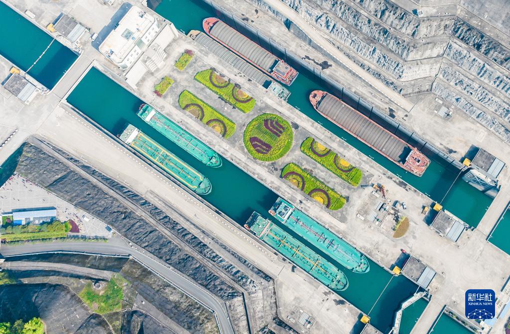4月1日,船舶有序通過三峽雙線五級船閘(無人機照片)。