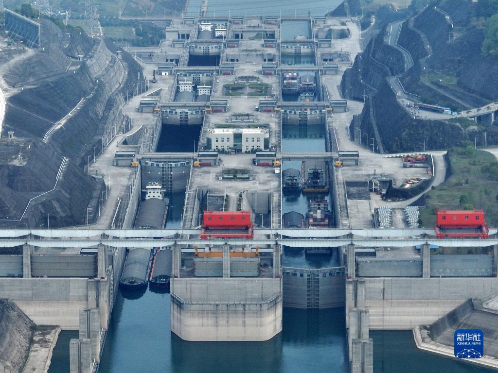 4月1日,船舶有序通過三峽雙線五級船閘(無人機照片)。