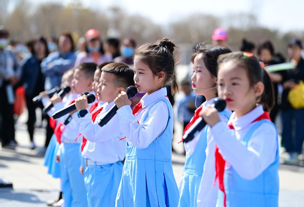 4月1日,小朋友在康巴什區亞洲雕塑藝術主題公園朗誦詩歌。
