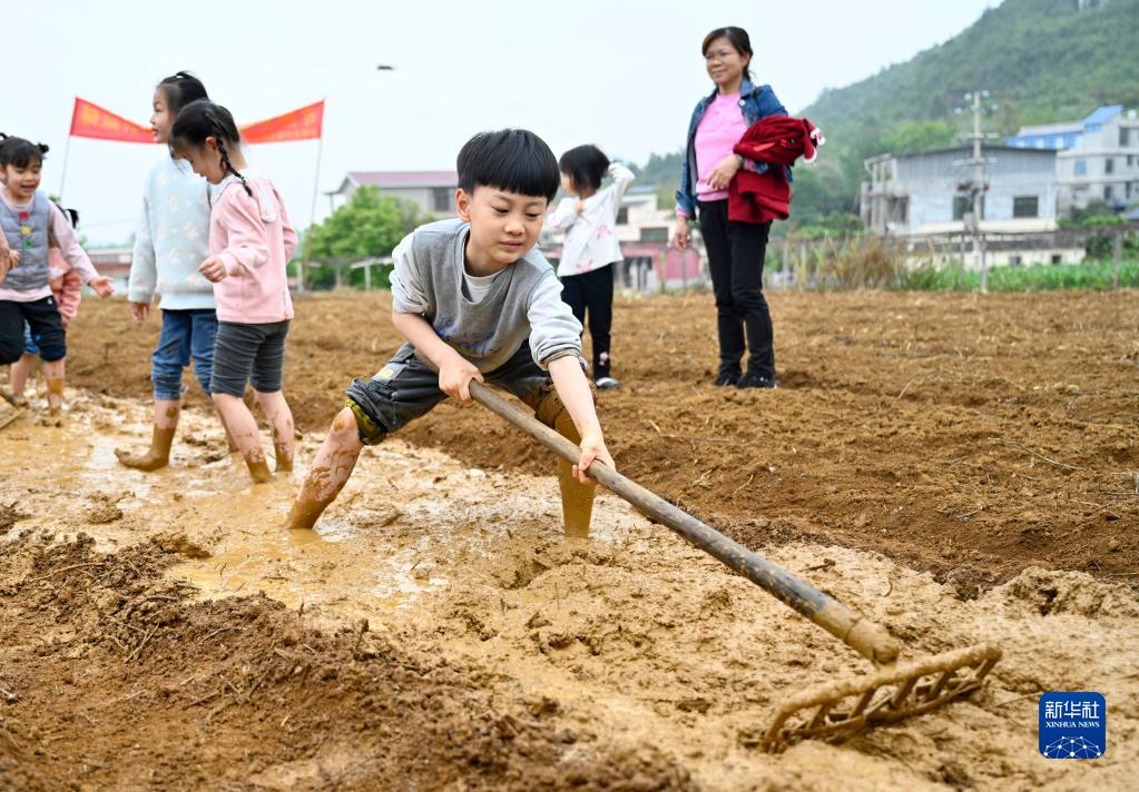 4月1日,在柳江區進德鎮龍新村龍朝屯,小朋友在家長陪同下體驗平整土地。