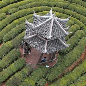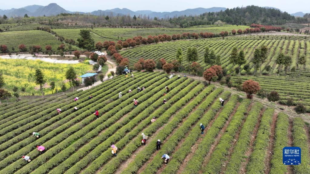 4月1日,村民在岑鞏縣天馬鎮一茶葉種植基地采摘明前茶(無人機照片)。