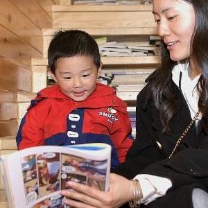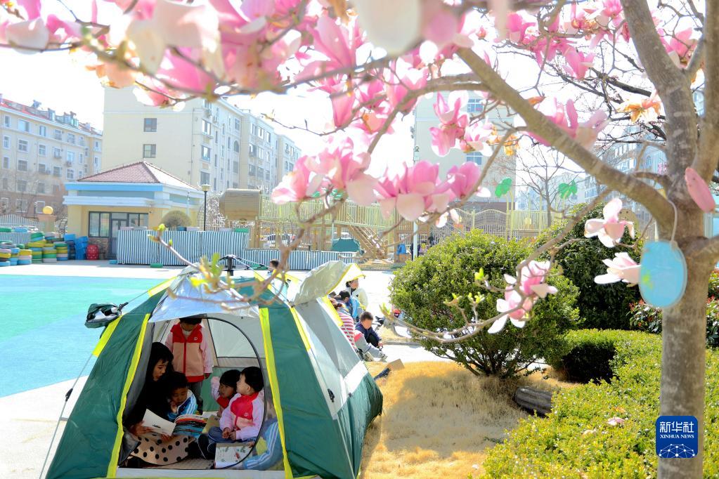 3月30日,在山東省青島市西海岸新區濱海新村幼兒園,家長和幼兒在校園里閱讀繪本。