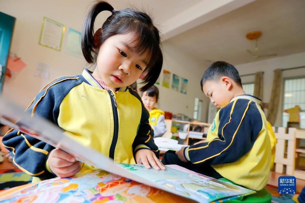 4月1日,江西省吉安市峽江縣幼兒園的小朋友在閱讀圖書。