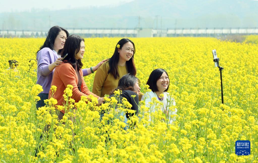 4月1日,游客在汝陽縣三屯鎮東保村千畝油菜花田拍照留念。