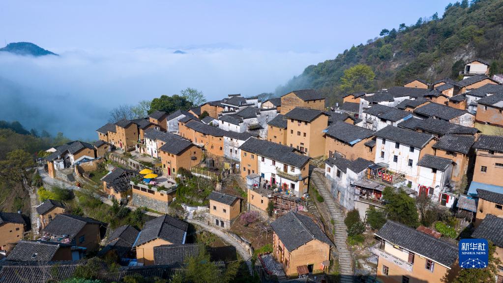 云霧繚繞的山村春景(4月1日攝)。