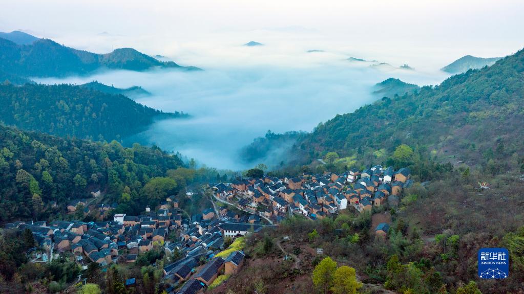 云霧繚繞的山村春景(4月1日攝,無人機照片)。