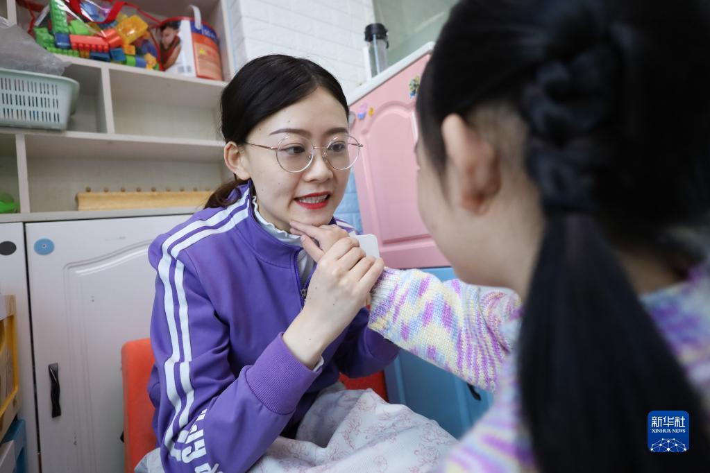 3月30日,特教老師陳進為孤獨癥兒童指導發音訓練。