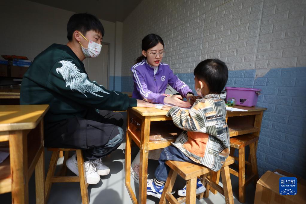 3月30日,特教老師陳進(中)為兒童進行精細動作評估。