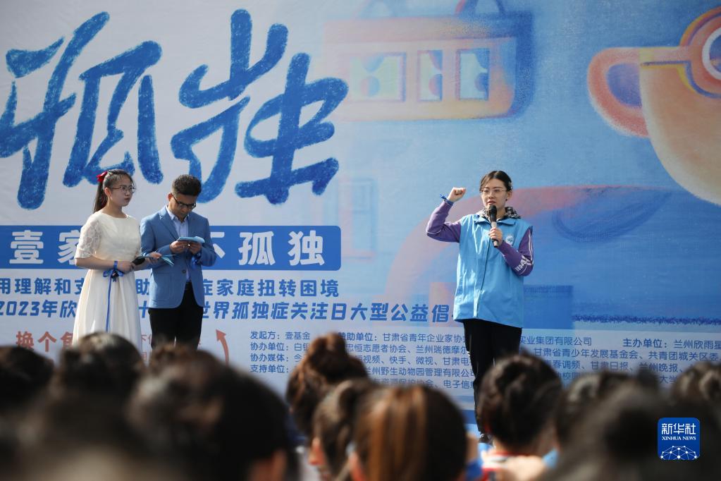 4月1日,特教老師陳進(右)在蘭州一孤獨癥日公益活動上帶領志愿者們宣誓。