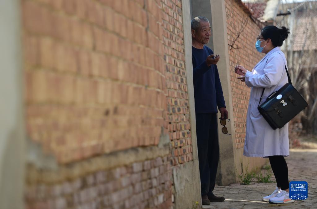 4月1日,鹽山縣孟店鎮東小盧村大學生村醫張花蕊回訪老年患者。